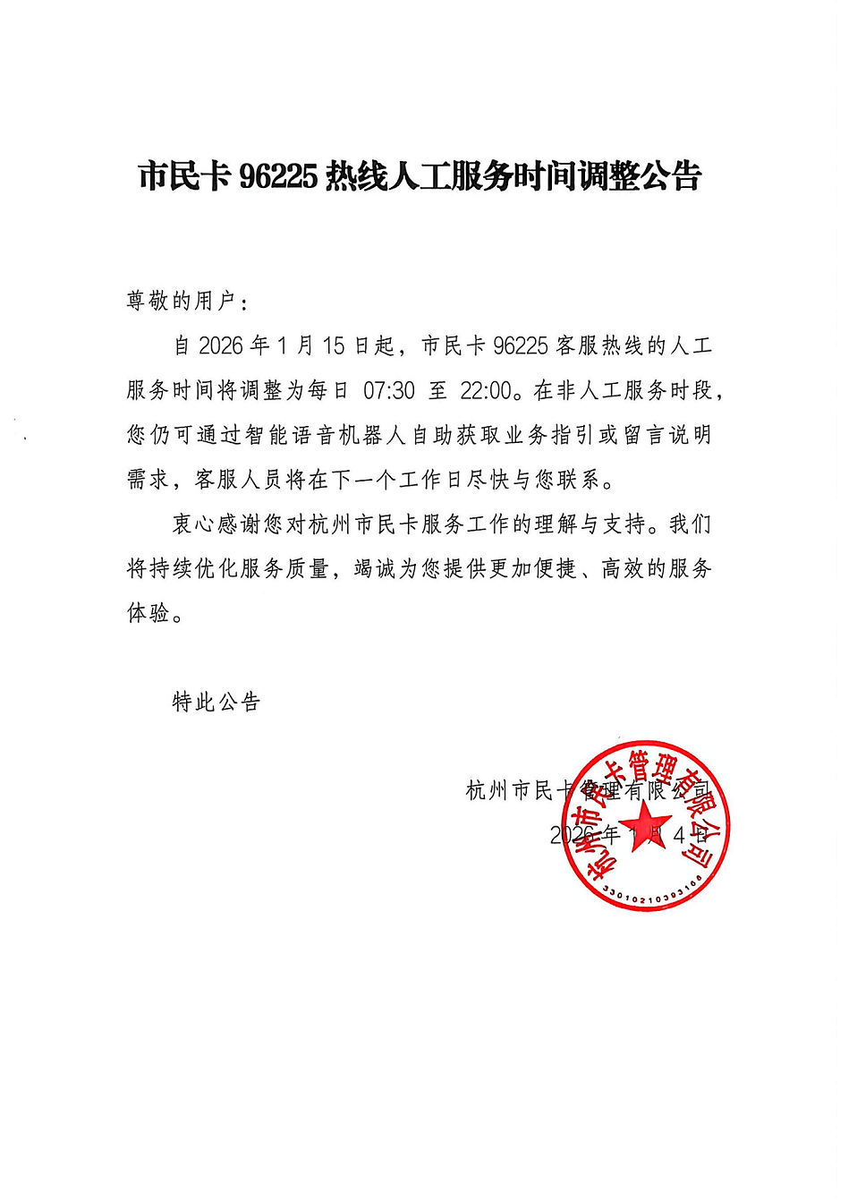 市民卡96225热线人工服务时间调整公告